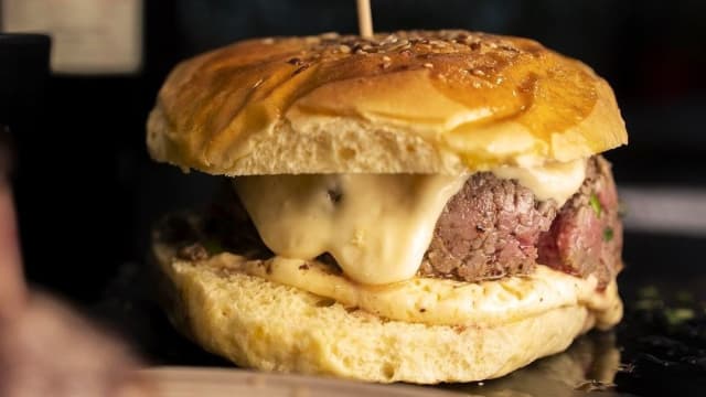 Pan brioche, mostarda, insalata & pomodoro, cheddar, uovo fritto.