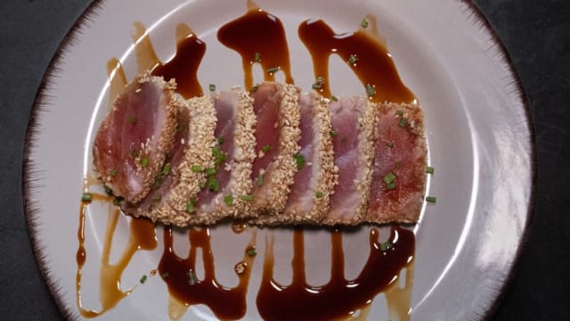 Lombo de atum braseado em “crosta” de sementes de sésamo salteados com molho teriyaki