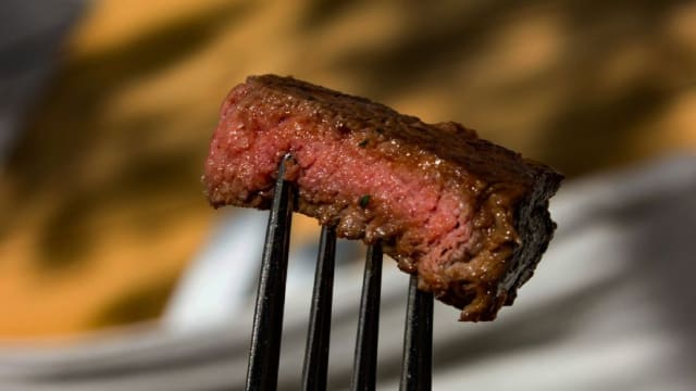 200 g de carne de bovino, redução de vinho do porto e cebola caramelizada