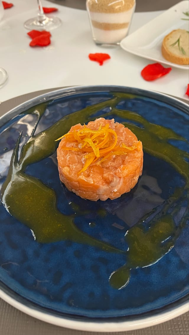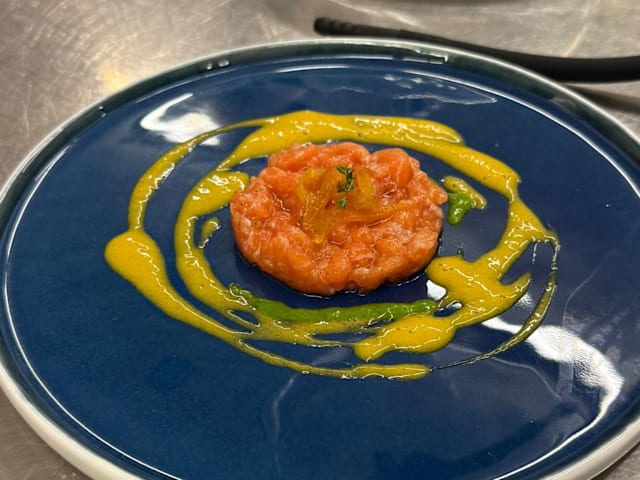 Tartare di salmone affumicato con frutto della passione e arancia candita