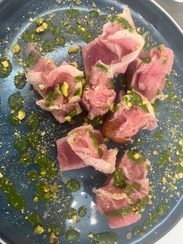 Tataki di tonno con crudo San Daniele, polvere di pistacchio salato e olio al basilico