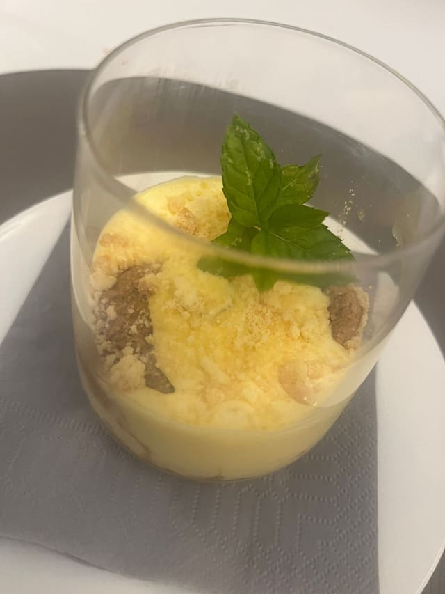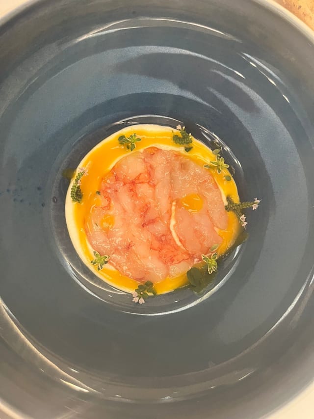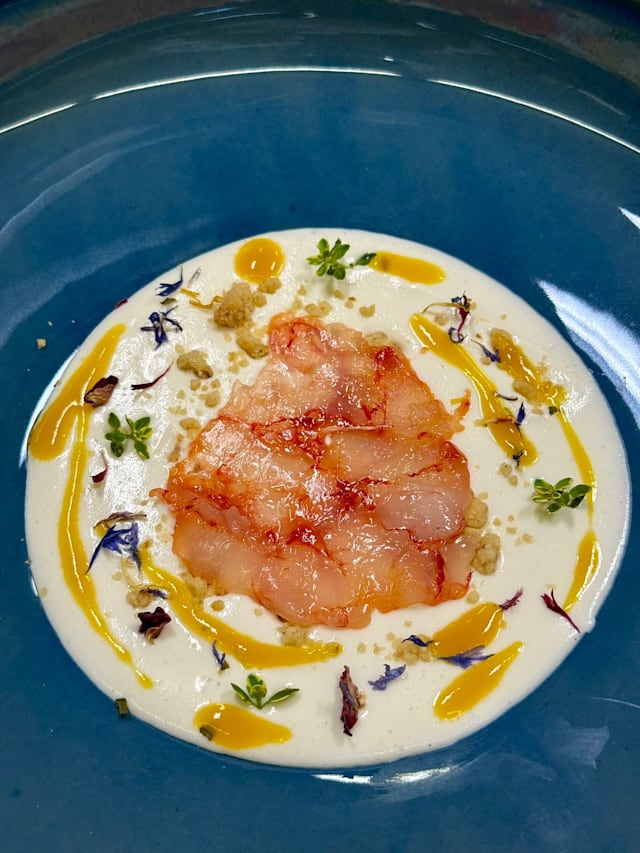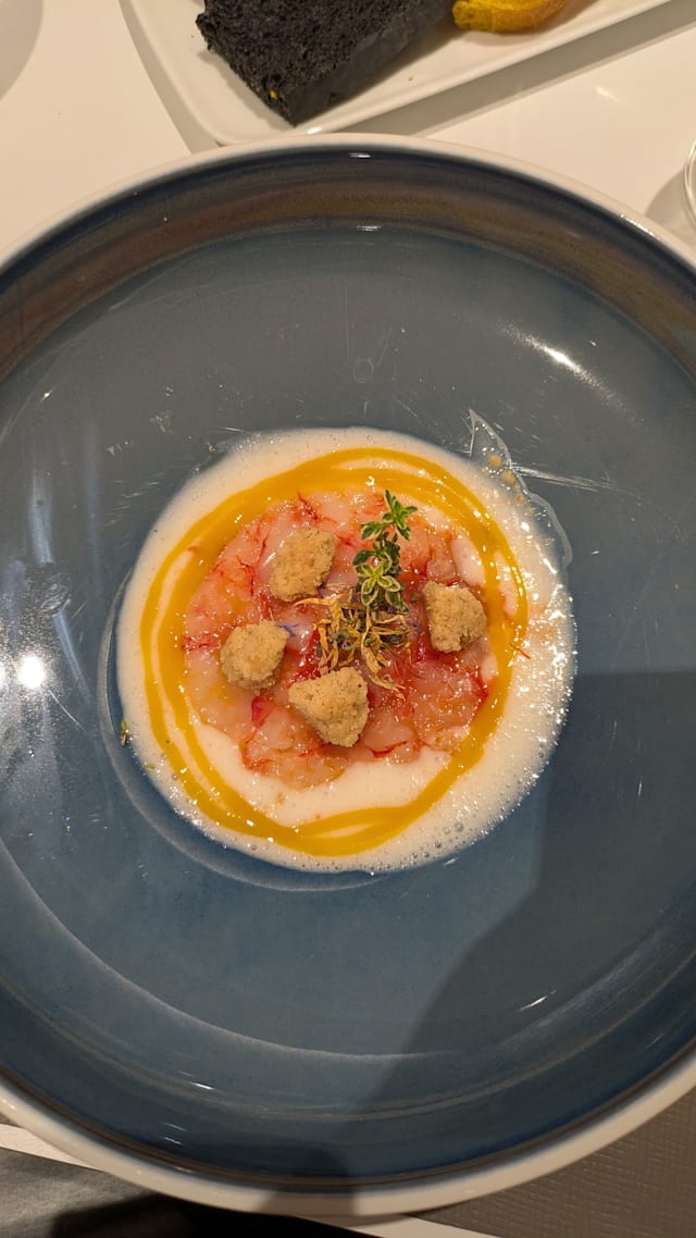 Carpaccio di gambero rosso, salsa alle mandorle, mango con crumble alla nocciola
