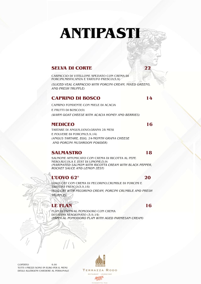 10/10Our server, Leo, was the best. Great suggestions on wine, drinks, and food. The Queen Florenrine was fit for a king. The ambience was perfect rooftop location overlooking the Via del Calzaiuoli. Ideal restaurant stop while in Florence.