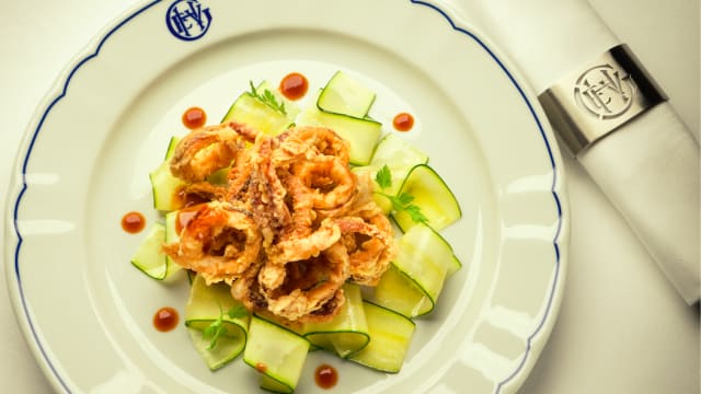 Fritto di totani con tartare di avocado, pomodoro, chutney di cipolla rossa.