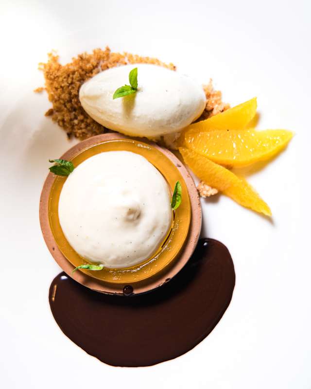 - Mousse al cioccolato con gel di arance, crumble alle nocciole e salsa