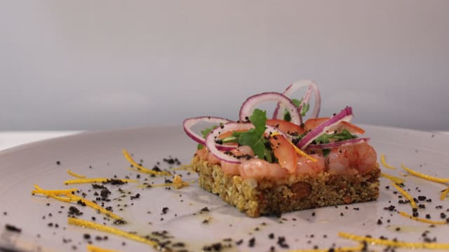 - Four taste interpretations with bran bread, cocoa bread and cereal bread with: – intense flavour ricotta cheese (fermented ricotta cheese) cream, Cantabrian Sea anchovies, fresh parsley and lemon zest; – Tassel hyacinth bulb and tuna cream, crunchy courgettes; – Stracciatella cheese, small tomato