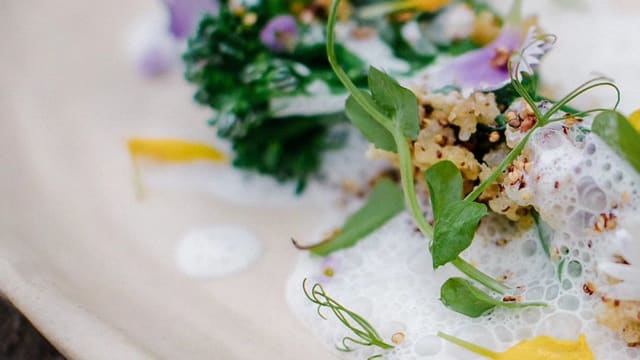 Ravioli recheado com ovo a baixa temperatura, puré de espinafres e picke de alcachofra