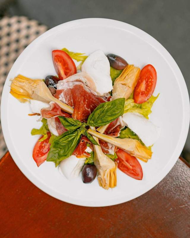 - Salade, jambon san daniele, mozzarella di bufala, artichauts et tomate