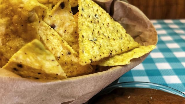 Tortilha recheada com totopos, queijo, milho, cebola caramelizada,molho de tomatillo e molho da casa picante. Acompanhado de feijão preto da tété para mergulhar a sua quesadilla.