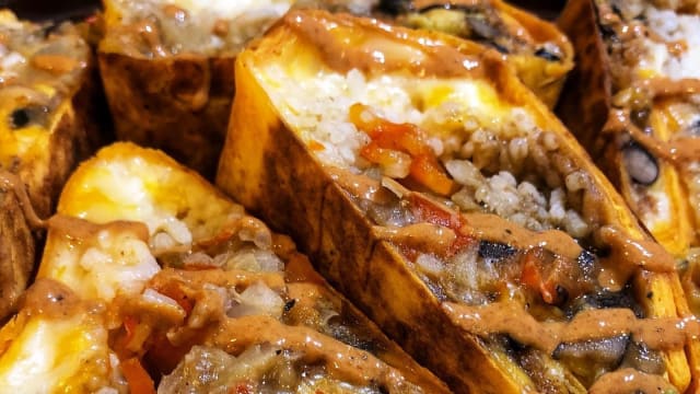 Jaca com sabor a barbecue, arroz, feijão preto, queijo , milho, jalapenos,cebola caramelizada, creme azedo, batata palitos e salsa verde