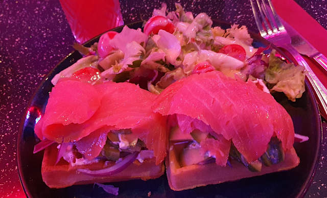 - Deux gaufres toasties gamies de st môret, avocat, saumon fumé, cignon rouge et tomates cerises. Servies accompagnées de salade et tomate.