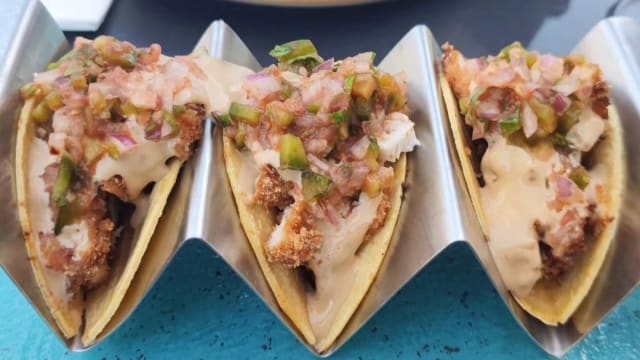 Tacos de pollo crijiente, chillinaisse y pico de gallo