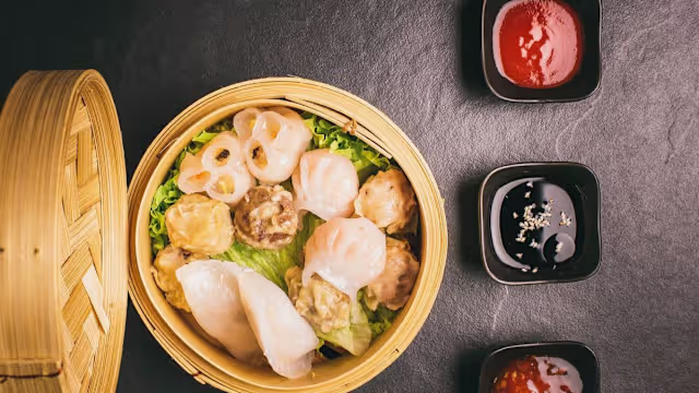 - Bouchées au crabe, crevettes, porc, légumes, sauce “plum”