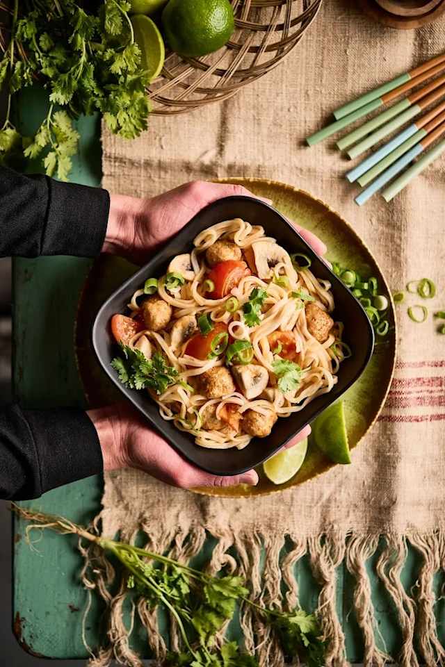 - Nouilles plates étroites. Garnitures: émincé de poulet, porc mariné, émincé de boeuf, petites boulettes de poulet ou légumes variés.