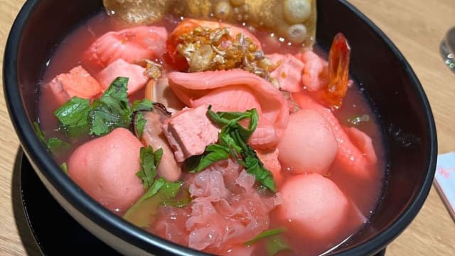 Soupe de nouilles de riz, rosée aux boulettes de poissons et fruits de mer