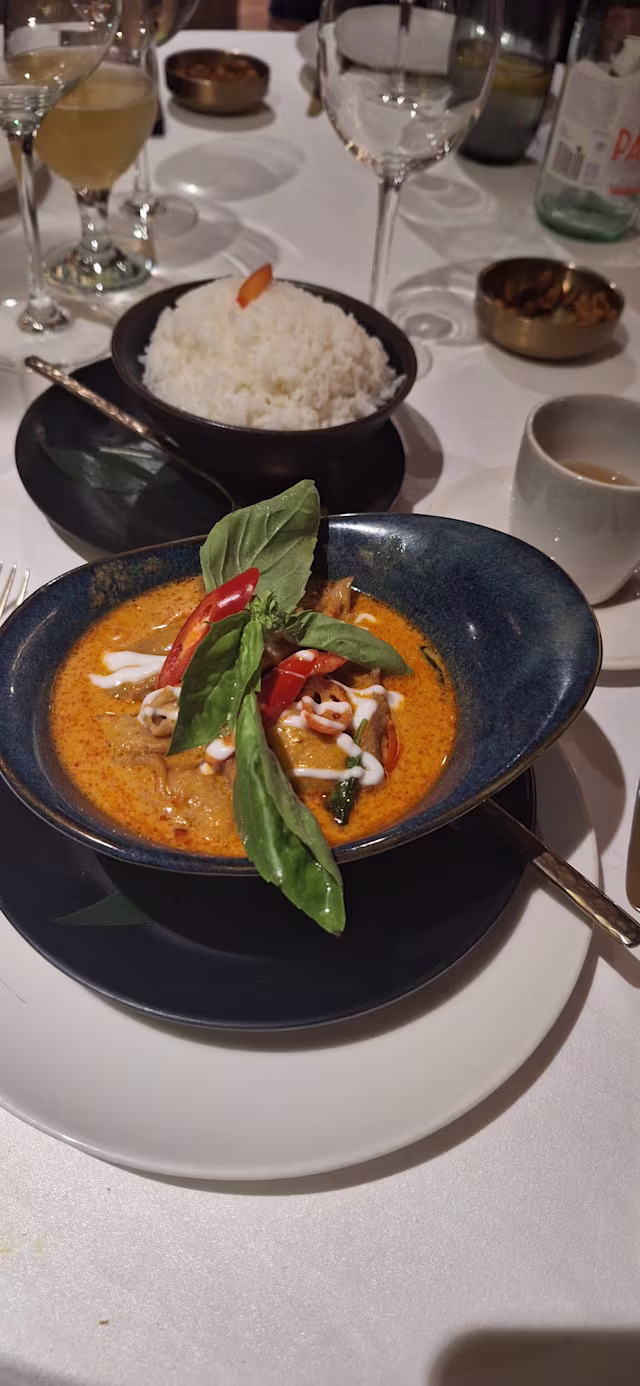 - Suntuosa preparación de langostinos, vacuno o pollo al curry verde con pulpa de coco, brotes de bambú y albahaca thai. Servida en el propio coco fresco y acompañada de los tradicionales tallarines blancos al vapor khanom chin. Homenaje a nooror steppe, primera chef de cocina de blue elephant.