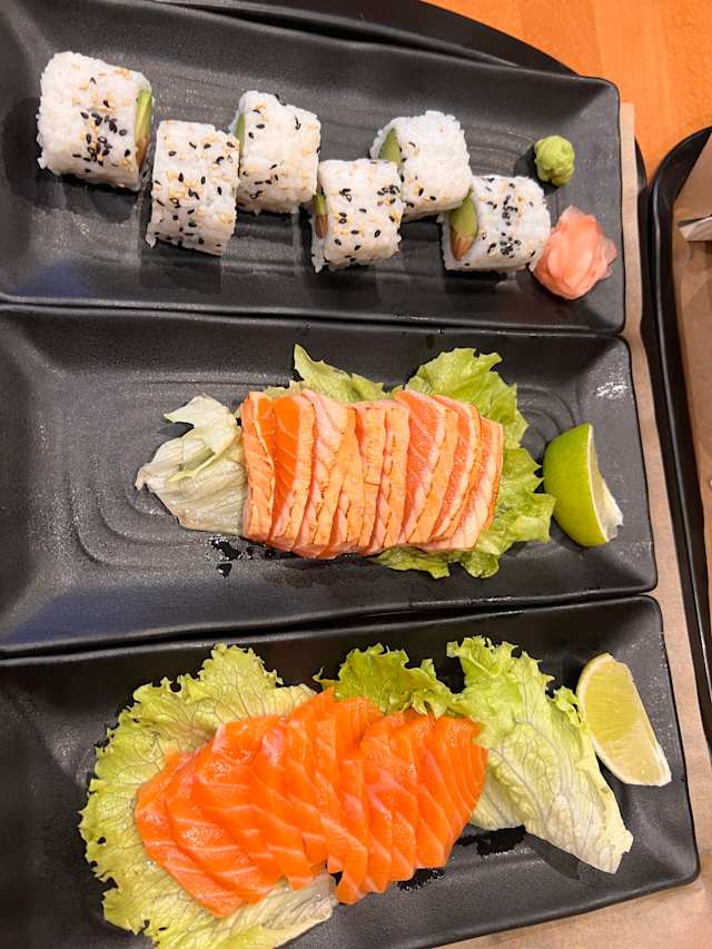 6 Jap rolls avocat cheese, 4 sushis saumon cheese, 6 california saumon cheese. Servit avec une salade de choux ou un bol de riz ou un bol de soupe.