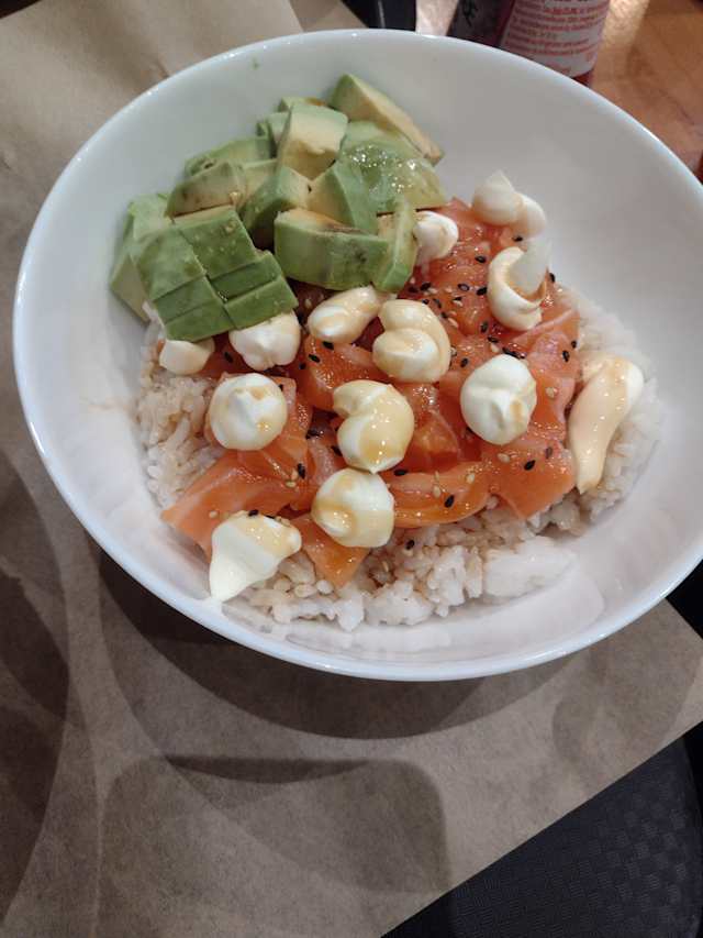 2 Sushi saumon, 2 sushi avocat cheese, 6 sashimi, 6 maki saumon avocat. Servit avec une salade de choux ou un bol de riz ou un bol de soupe.