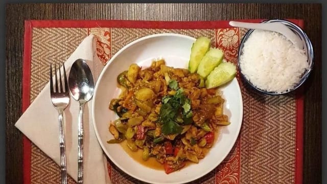 Stir-fried dry red curry with Fhicken (vegan chicken), Thai basil, eggplant, bamboo Turkish bell pepper, chili pepper, long beans and onions