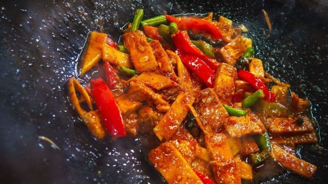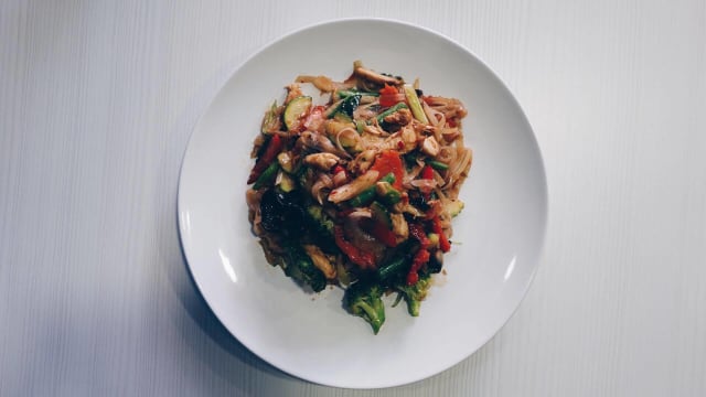 Tallarines de arroz salteados con aceite picante, verduras y albahaca