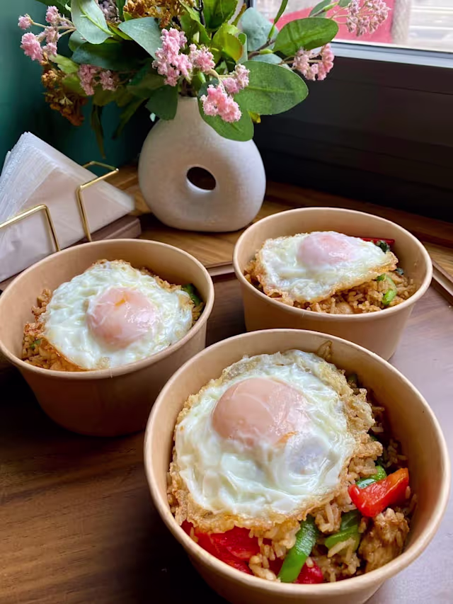 - Arroz frito con huevo, verduras, carne y condimentos sabrosos.