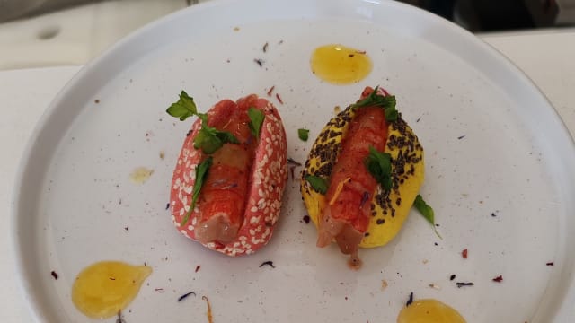 Cannolo salato con ripieno di ricotta, glassa agli agrumi, tartare di gambero rosso marinato alla sambuca, limone e pepe rosa.