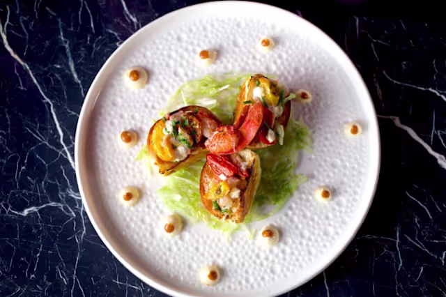 - Panino all’astice, maionese alloro, cipolla cevennes caramellata, bun al pomodoro confit, caviale di astice