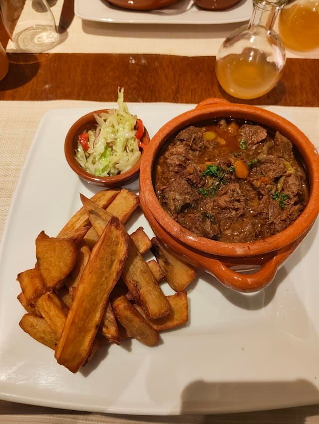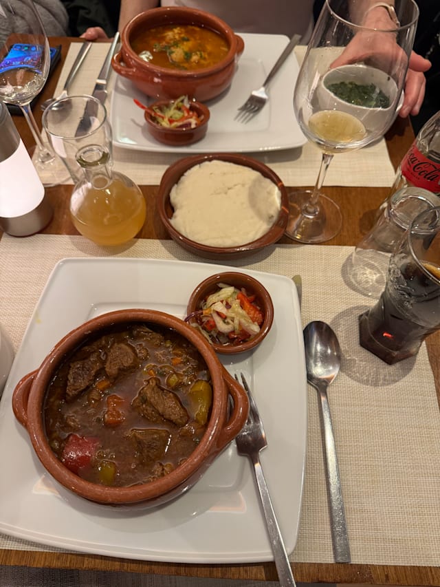 Rundvlees, kip of vis gekookt in een rijke mix van afrikaanse kruiden, uien, prei, wortelen en tomaten.