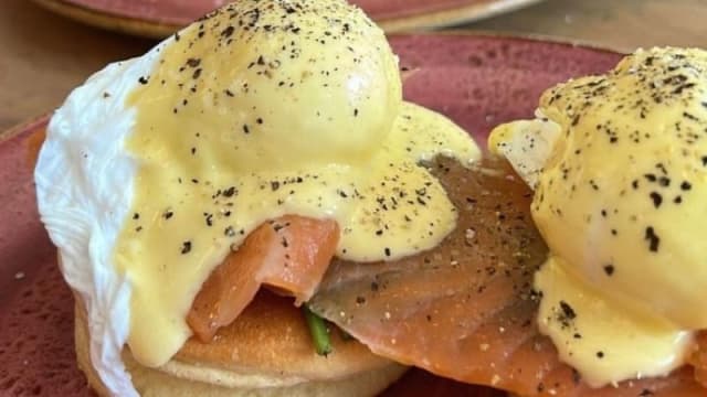 - Poached eggs, avocado smash, bacon, tomato, english muffin, little gem, hollandaise sauce