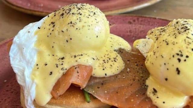 - Poached eggs, avocado smash, bacon, tomato, english muffin, little gem, hollandaise sauce