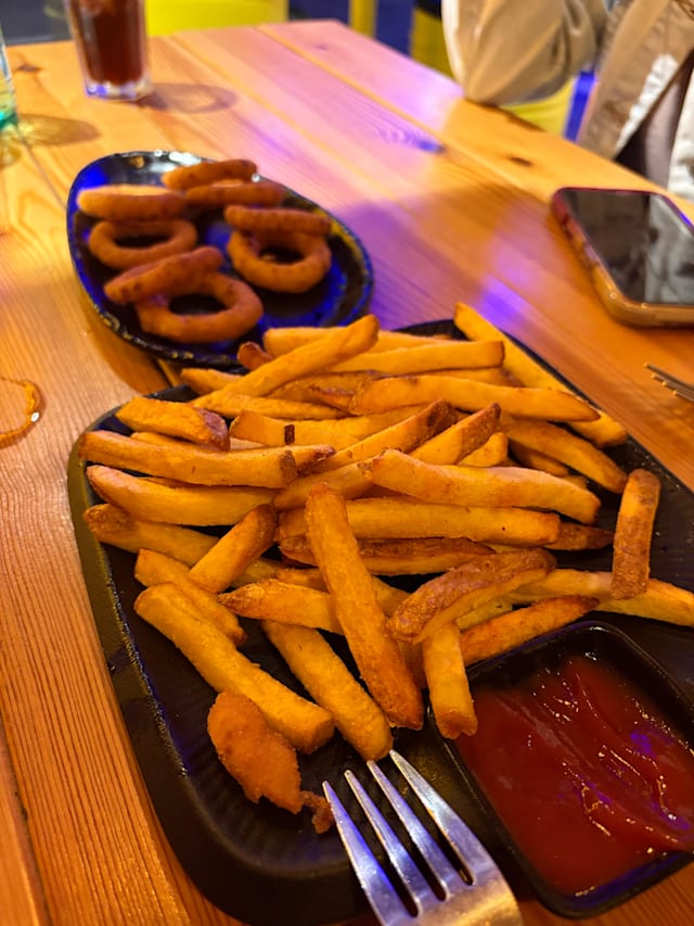 6/10The food was tasty, however the fries and onion rings arrived as a starter and the burgers followed later (10mins+). There was no atmosphere apart from the noise of the tv programme the staff were watching on their phone.