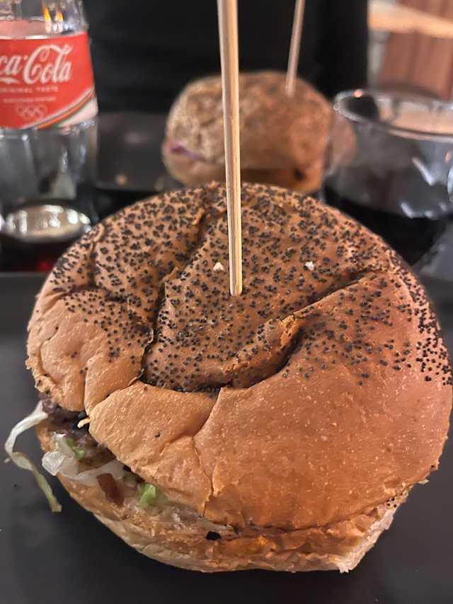 Due patty di manzo smashato (80g l’uno), cetriolino, doppio cheddar, uovo all’occhio di bue, pancetta rustica croccante