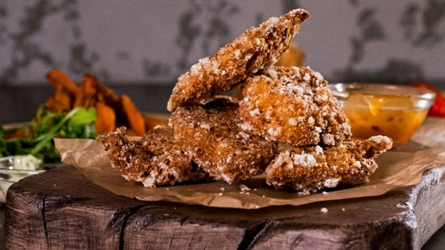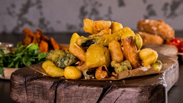 Pollo fritto, toma alla birra, pomodori, insalata iceberg, salsa agrodolce