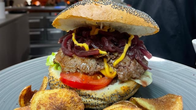 Due patty di manzo smashato (80g l’uno), maionese lime peperosa e aglio, doppio cheddar, jalapeno caramellato, rondelle di cipolla rossa cruda