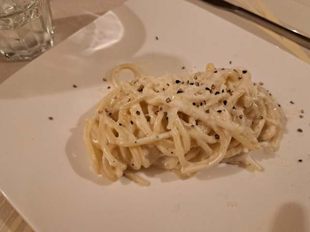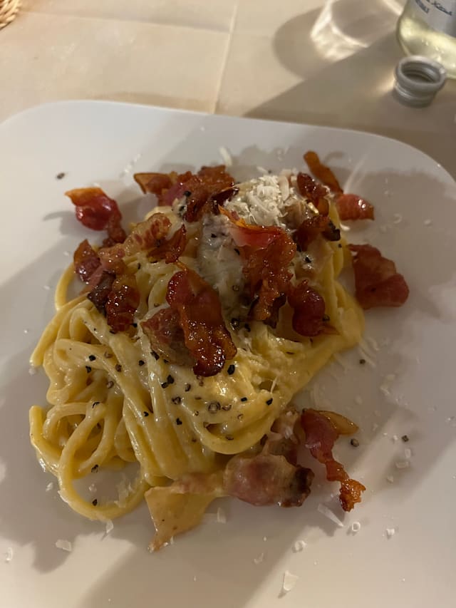 10/10WE arrived with a booking at 21.30 after a long drive . The restaurant is set back from the chaos of the front - we were met with a smile and a pleasant Hello . WE chsoe a table outside - the extra effort was not a problem , we had a local red wine , the most AMAZING Carbonara we have ever tasted - the super lady chef ( the wife of the owner) makes it with passion and love .. just the best ... lovely people , Also , Make sure you take a bottle of thier Olive oil ... Olive Nectar ----
