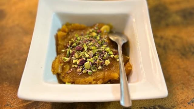 Royal rose-scented yogurt drink topped with pistachios and saffron.