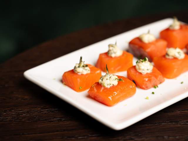 - Dados de salmón, mayonesa de eneldo, ralladura de lima