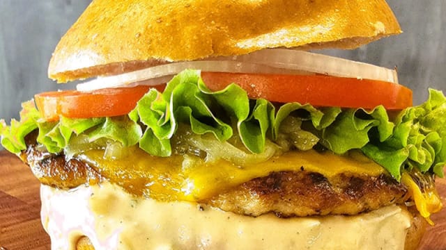 - Hambúrguer vegetariano de proteína de soja panado e crocante, servido com alface, coleslaw, picles, cebola frita crocante e molho honey mustard, tudo em um pão brioche.