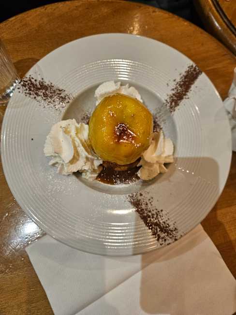 6.5/10Food was mediocre. Onion soup. Risotto. Chocolate mousse. All ok. But not better than ok. (Soup had a slimy texture underneath the cheese, risotto was too mushy - no bite, and the mousse - felt as if they bought it somewhere, it wasn't particularly good, and simply served it). Service was nice. The atmosphere - again - not bad, but not particularly good either. Bottom line: There are tastier places for similar prices.