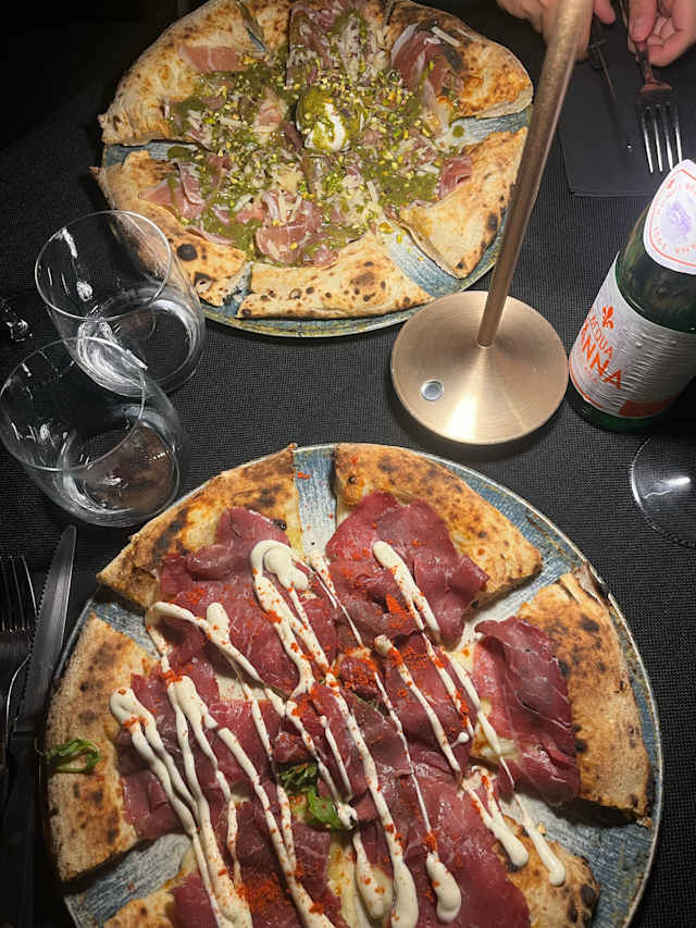6.5/10Attractive and stylish space with a refined, modern atmosphere. The lighting is quite low — just one table lamp for four people, which makes the dinner feel more mysterious than intimate. We ordered a bottle of Il Paturno and four pizzas, finishing with coffees. The bill came to around €125, which was perfectly reasonable. The pizzas were good, well-made, but not exactly dazzling. The background music was a bit loud, turning the cozy mood into a small vocal competition — everyone speaking a tone higher just to be heard. Overall, a pleasant experience with friendly service and a beautiful setting, though it could use a bit more light… and a few fewer decibels.