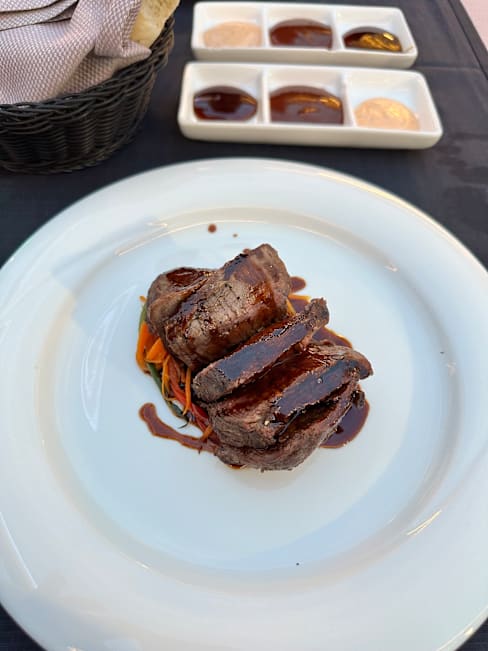 4/10Not cozy interior, too light, too cold. Sat next to air condition. The duck had a bad aftertaste and came with no potatoes as described. Entrecote too much fat and also without potatoes. Tried to complain, bit did not seem to care.