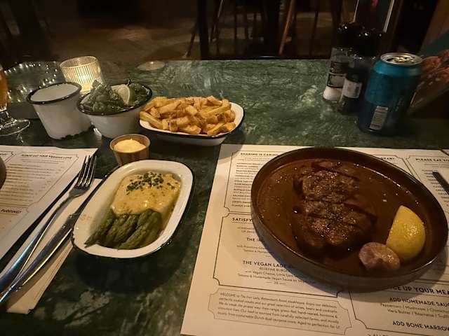 4.5/10Dinner on 2th of December Tuesday evening for dinner. My partner and I ordered a Rib eye with vegetables and a Sirloin steak with fries. Mine wasn’t warm when served. It wasn’t medium rare I ordered and a bit more than medium unfortunately. Fries were not warm and asparagus was not fresh. Portion was standard, not too much and not way too less. We both ordered desserts after finished our main course. Waited for close to half an hour. Nice interior and have some distance with the table surrounding. But truly disappointed on the food quality. About €60 per head for dinner, I believe that there are other better options at the similar price point in town.