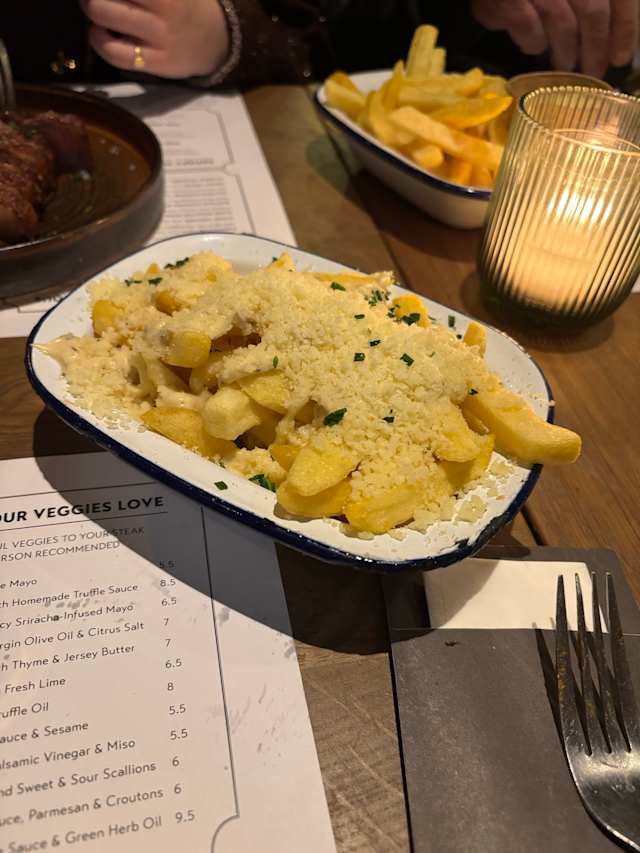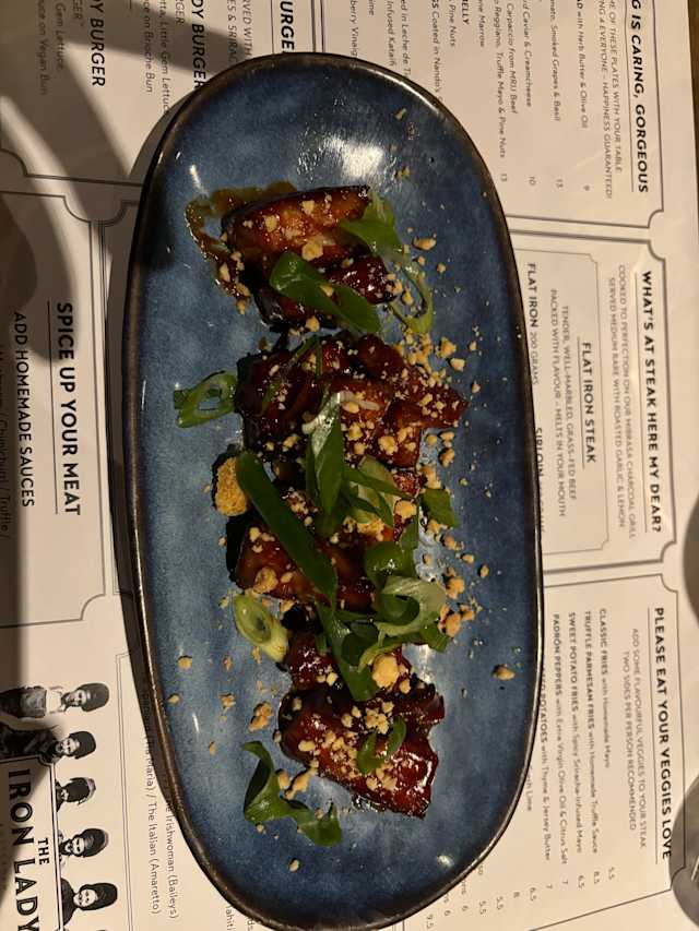 - Pork ribs with bourbon bbq sauce, sesame & onion with fries & mayo. Served medium rare with roasted garlic & lemon