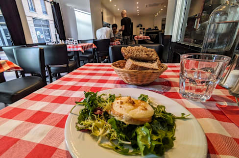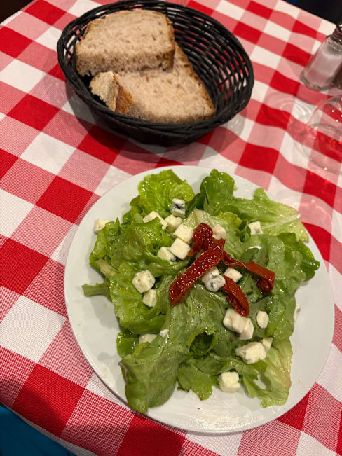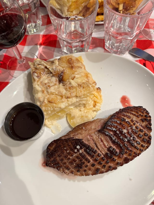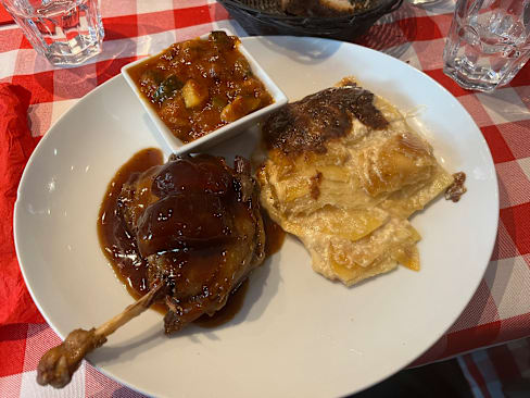 8.5/10Crusty rustic bread. Roquefort salad. Big duck breast great with honey thyme sauce and gratin potatoes. Nice sweet white wine.