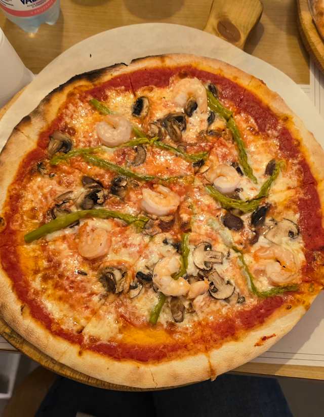 - Pomodoro, mozzarella, asparagi, funghi, gamberetti