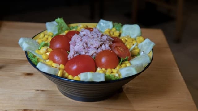 Cherry tomatoes, tuna, corn, cucumber