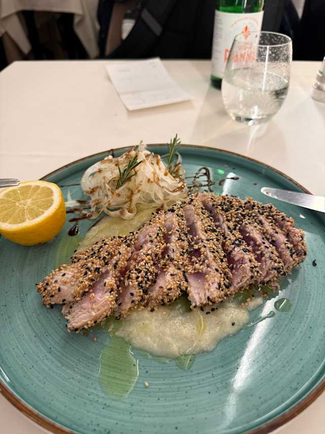 7/10Strange but nice! Hard to understand the vibe, is it a cosy local cheerful cantine, or touristy? Simple Italian food, pretty fresh and nicely cooked. Menu seems a bit too long for quality but my swordfish was good and great veg side dishes. Particularly excited to be able to choose spinach however you want it! It felt a bit like a noisy old fashioned hotel dining room. Warm cosy lighting and all in all a jolly experience…