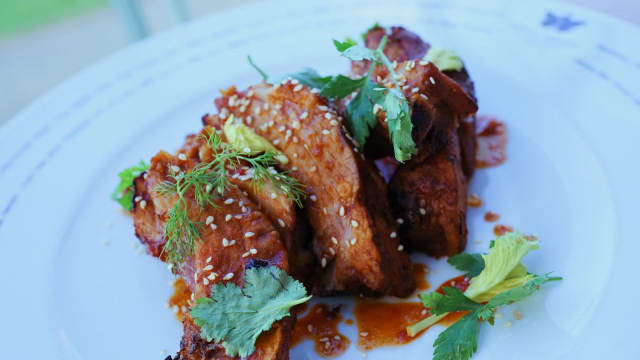 Roast Beef Salad “Algarvian-style” Carrot Purée, Black Sesame, and Pickled Raisins