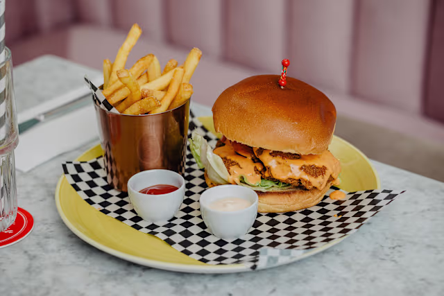- Double beef patty, cheese, rocket, ‘mag’ sauce, burger bun, french fries