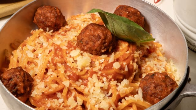 I nostri iconici spaghetti al sugo di pomodoro datterino, grana, basilico e polpette a scelta